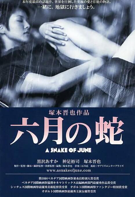 六月的东京,连绵不断的梅雨,让人心烦意乱,欲念横生。供职于心理咨询室的少妇凛子(黒沢あすか 饰)与丈夫(神足裕司 饰)过着优渥的生活,然而夫妻虽然相爱,却因丈夫洁癖的原因始终没有性事。贤淑温良而又倍感压抑的凛子只能通过自慰寻求片刻的满足。某天,一个名叫道郎(冢本晋也 饰)的男子被自杀的念头所困扰,于是打来电话求助。道郎在凛子的开导下渐渐摆脱自杀的泥潭,却转而沉迷于凛子的温柔中。他以凛子自慰的照片作要挟,逼迫这个一贯保守的女子做出一件又一件令她倍感屈辱的事情…… 本片根据导演冢本晋也的同名小说改编,并荣获2002年威尼斯电影节圣马科评审团特别大奖、2003年葡萄牙国际奇幻影展最佳女主角(黒沢あすか)和评审团大奖。