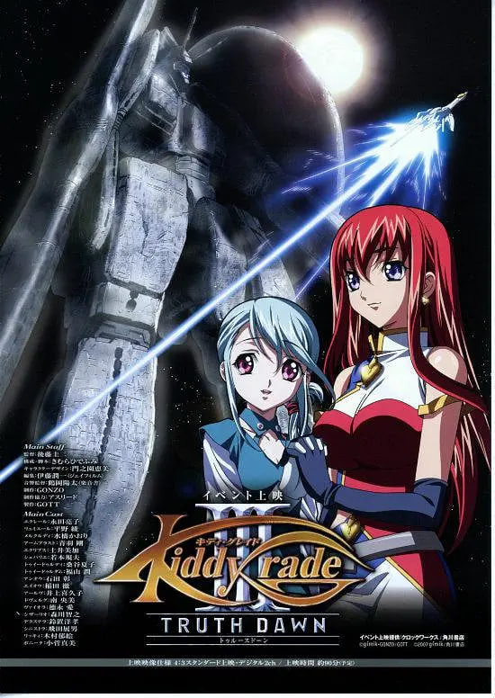 《Kiddy Grade》是一部根据小说和漫画改编的人气科幻动作动画。这是三部曲电影系列的最后一部,该系列电影重新剪辑了 24 集电视连续剧,增加了新的场景。艾克莱尔是一位美丽、强壮且战斗能力超强的女孩,而卢米埃尔是一位聪明的女孩,其信息处理能力堪比计算机。两人的能力和性格截然相反,作为银河贸易和关税组织(GOTT)的特工,解决星际和组织间的争端。
